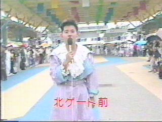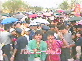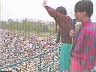 エキスポプラザ。閉会式準備中。 田代と桑野。サングラス、まだシャネルズを引きずっていた頃か。 ギャグ「そりゃあいいや〜」を連発しているが、今聞くとよくわからない。 |